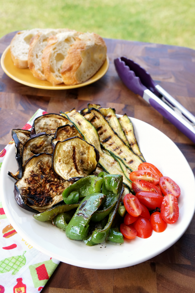 - When the grill is hot, place the zucchini, eggplant, and peppers on and let them cook for 4-5 minutes undisturbed.