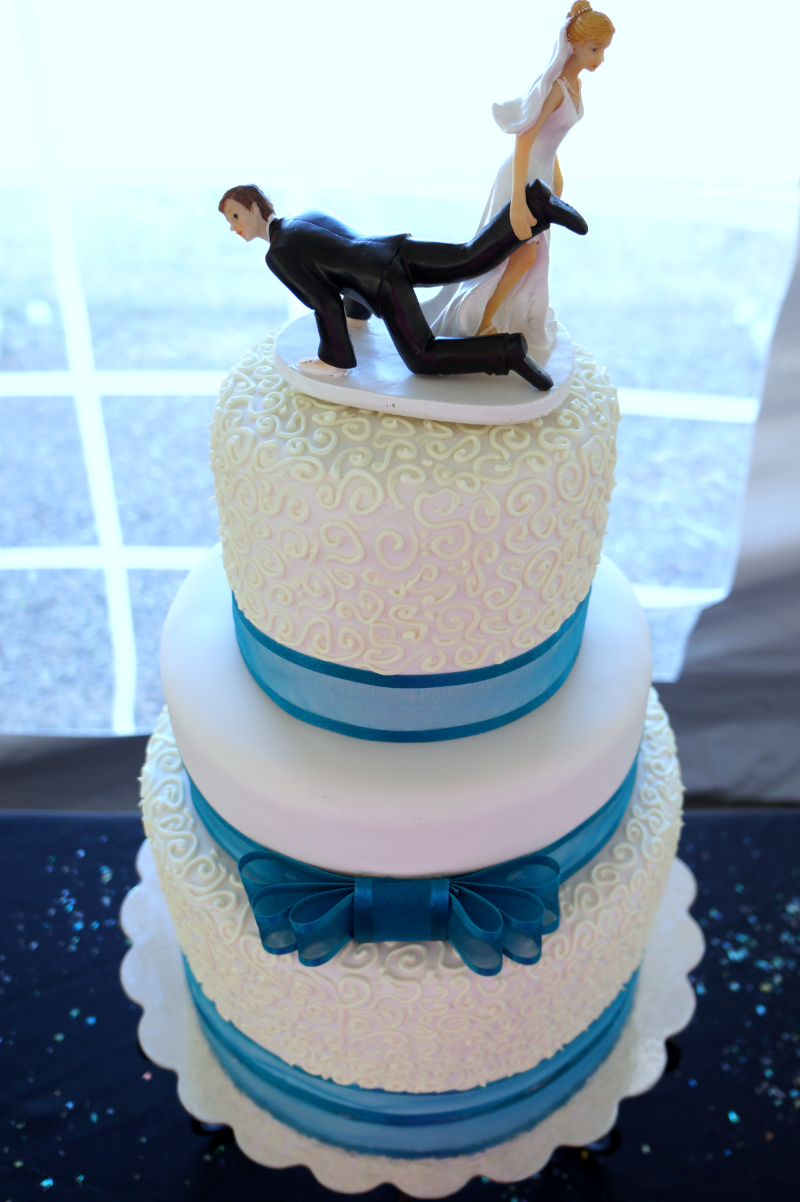 Happy Monday! Today I am sharing the gorgeous wedding cake I made a couple of weekends ago! This was so much fun, and I am obsessed with how it turned out. It's definitely a different style than my last BIG cake, which was very girly and had lots of pink and flowers and pearls. This one was a bit more streamlined and sophisticated, with sheer turquoise ribbons and lots and lots of hand-piped swirls! The bride bought the cake-topper herself, and I seriously died laughing when I saw it. She is so sassy, and this topper is totally perfect for this couple!