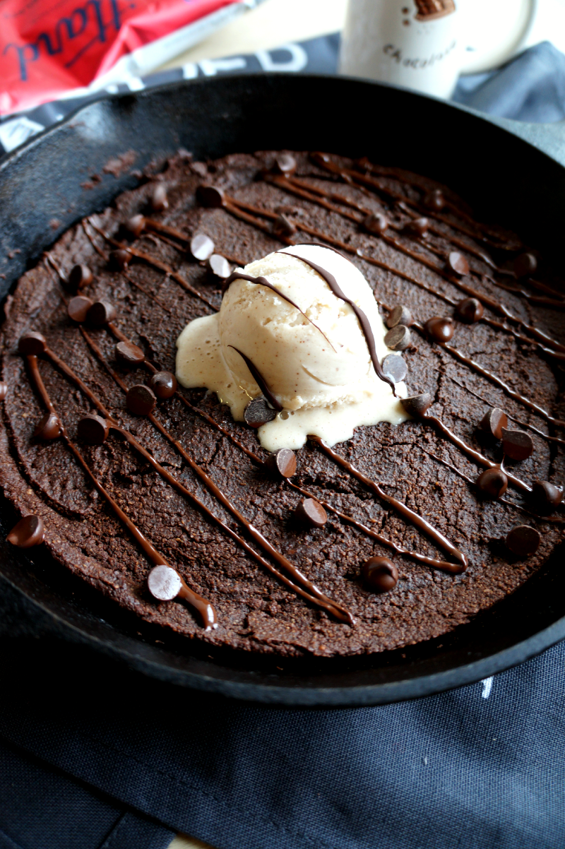 The weather has been insanely cold all over the US lately {unless you're in Florida, in which case... ahem. We're not speaking}, and I've been basically surviving off of soup and more soup and hot chocolate for the past week. I experimented with a black bean cake/brownie thing a few days and it was a semi-fail because I made it in a pan that was way too big, so it came out very thin and almost brittle-like. The flavor was really good, but the texture definitely needed to be worked on. I've noticed a bit of a skillet cookie trend going around the blogosphere lately, and I decided to combine the two and make a vegan, gluten-free black brownie in my cast iron skillet! This is seriously PHENOMENAL. It has a blender batter {which is really my favorite thing ever}, and it's incredibly delicious, rich, and fudgy. Yum, yum, and yum. Topped with some almond milk ice cream, this is nothing short of amazing. Think of it like the healthier, vegan version of the famous Pizzookie. You're welcome.