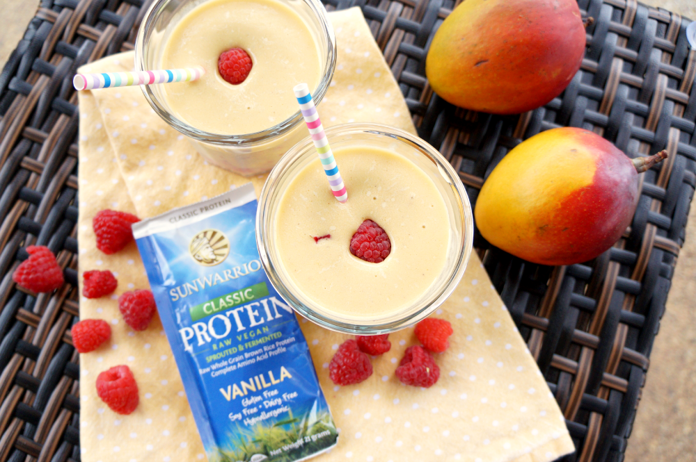 This smoothie is super simple and fast to whip up, but it's the perfect way to start your day {or end your workout} with a delicious, protein-packed snack. All you need is mangoes, raspberry, nondairy milk {I personally love vanilla almond-coconut milk!}, and of course a scoop of Sunwarrior Vanilla Protein. Add in some ice, blend until smooth and creamy, and it's ready to enjoy! Be sure to go to Sunwarrior's website to explore all of the different protein blends and flavors they have to offer, as well as awesome products like their Supergreens blend, Immune Shield, Liquid Light, Raw Vitamins, and much more! Happy shopping and happy sipping! 🙂