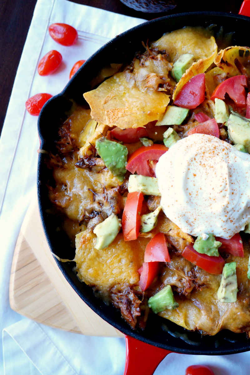 The Superbowl is almost upon us! I've talked before about how I don't think I've ever actually watched the Superbowl... or really any football game where I wasn't physically in the stadium, but I am always down for football food! These irresistible nachos are made with slow cooked "pulled" barbecue chicken, and piled high with thin and crispy chips, tons of cheese, avocado, and pico de gallo. Because you know, pico has vegetables and that makes this healthy, right? Yep. Let's go with that.