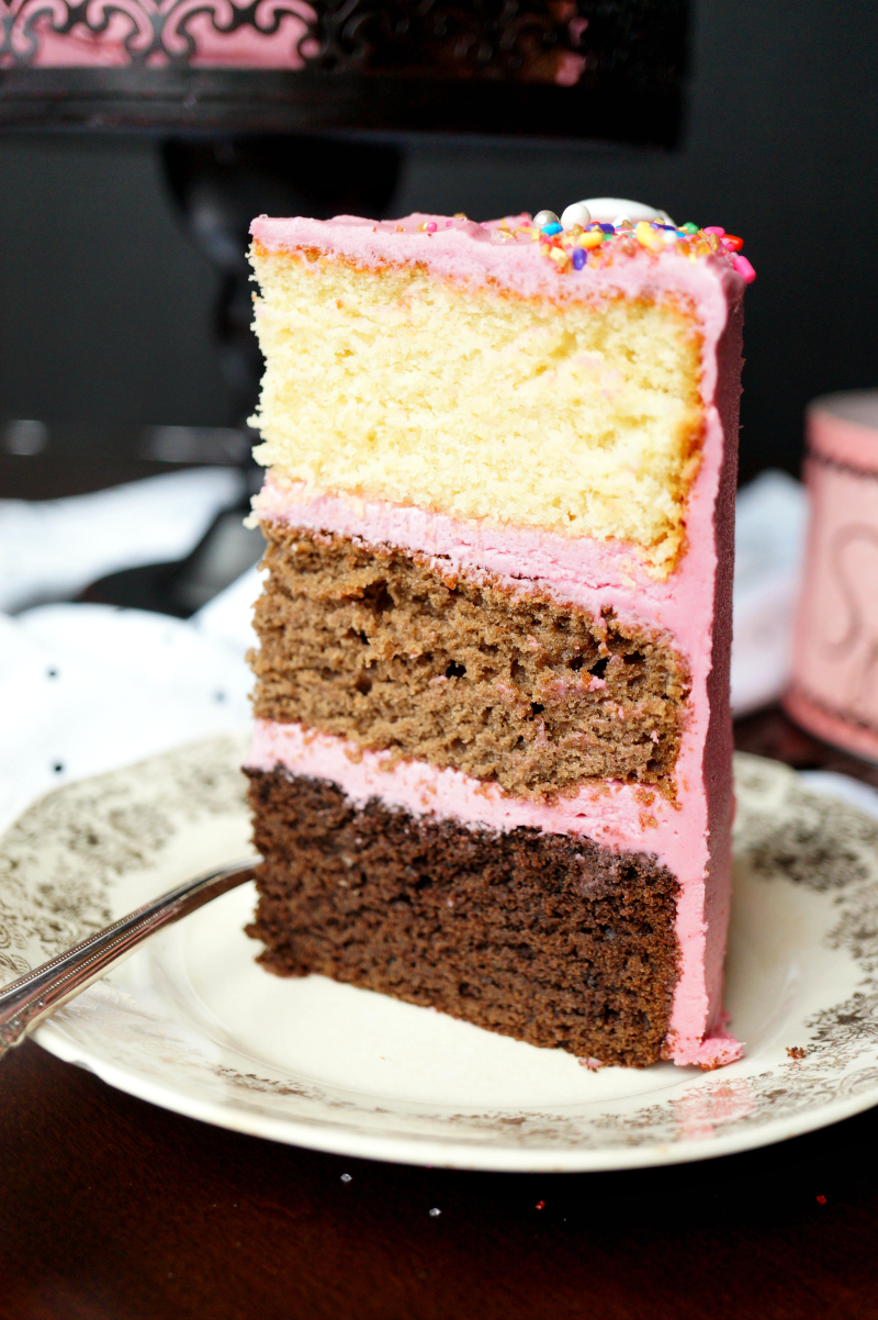 This dessert is stunning both visually and in terms of flavor! The pomegranate icing goes well with all of the cakes, but I have to say I think my favorite pairing is with the vanilla. The fruit flavor can be pretty subtle and easily overwhelmed by a stronger flavor like the chocolate, so the balance is perfect with the simple classic vanilla! I hope this beautiful dessert inspires you to create your own fun ombre chocolate cake. Don't forget the glittery sprinkles! 😉