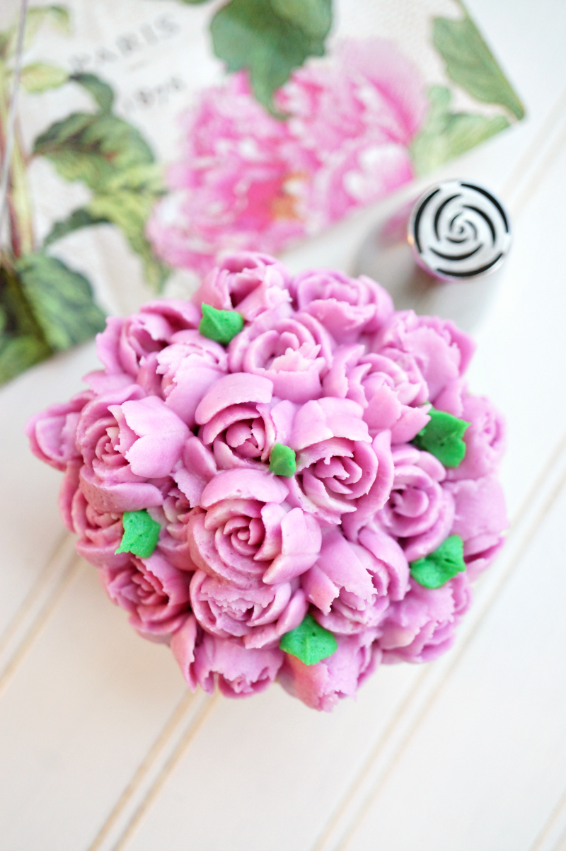 Another quick tip I will give you is to wipe off the tip every 3-4 flowers that you pipe! This keeps it from getting gunky and helps your flowers come out nice and clean every time. Also having slightly soft frosting helps too! If it's too hard then it'll have a hard time coming out of the bag (and it's more likely to stick to the tip instead of the cake) and if it's too soft, obviously it'll come out kind of goopy with poor details. Again, there's definitely a learning curve with these russian decorating tips but they are so easy to use!