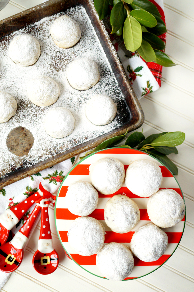 Christmas is coming up so soon y'all! Eeep! So much to do, so little time. I'm here to say that it's okay to take a break from the shopping and wrapping... and make some cookies! These Mini Chocolate Chip Snowball Cookies have been Christmastime staples in my household for ages and I can't believe they've never been shared on the blog before. They're soft, crumbly little balls of heaven. Let me show you how they're made!