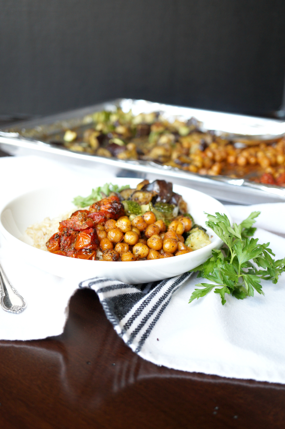 Hi friends and happy Tuesday! The week is back in full swing and I'm sure with all the Memorial Day festivities, we could all use a little healthy reset. I am sharing this Vegan Roasted Ratatouille Sheetpan Meal today which has become one of my FAVORITE things to eat! Tomatoes, chickpeas, zucchini, and eggplant are tossed with olive oil and herbs and roasted until caramelized and delicious. Serve over brown rice or quinoa and... well, that's really it. So simple and insanely flavorful!