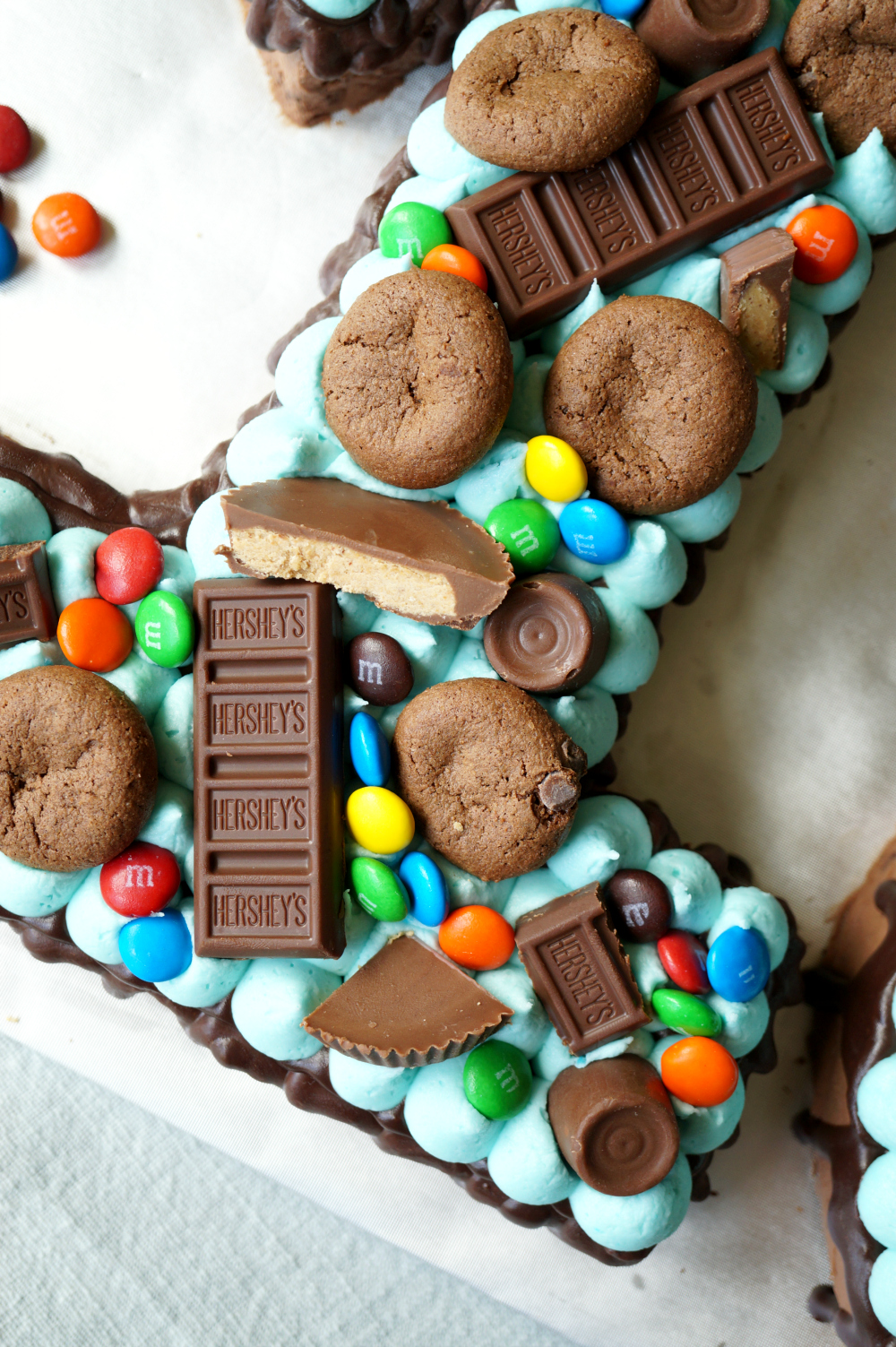 Next, I frosted the cakes using a chocolate frosting and then I did a chocolate ganache drip (just mixed semisweet chocolate chips with some heavy cream, melted in the microwave and then decorated with a squeeze bottle). And on top of THAT, I piped some vanilla frosting using a Wilton 1A tip (which is just a jumbo round tip). After that - the fun part!! I decorated my cutout number cake with mini Hershey's bars, M&Ms, Rolos, Reese's Cups, and double chocolate chip cookies. I happened to find these Home Free cookies