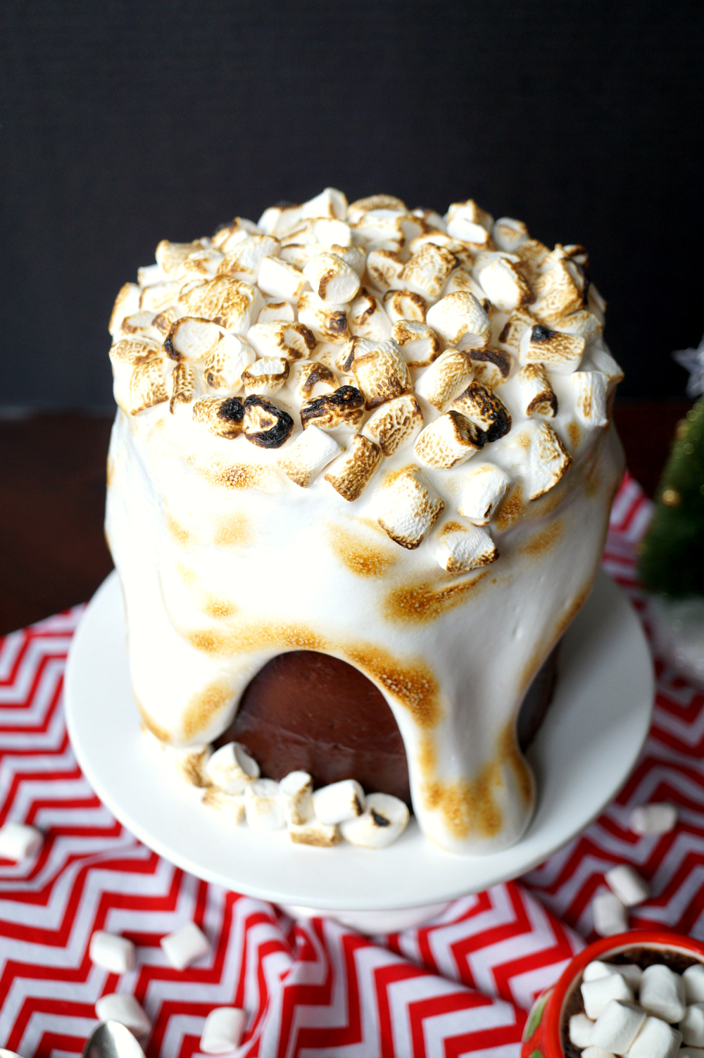 - When ready to serve, spoon some marshmallow fluff on top of the cake and let it drip down the sides. Add on some handfuls of mini marshmallows on top, and use a kitchen torch to toast if desired. Serve immediately!
