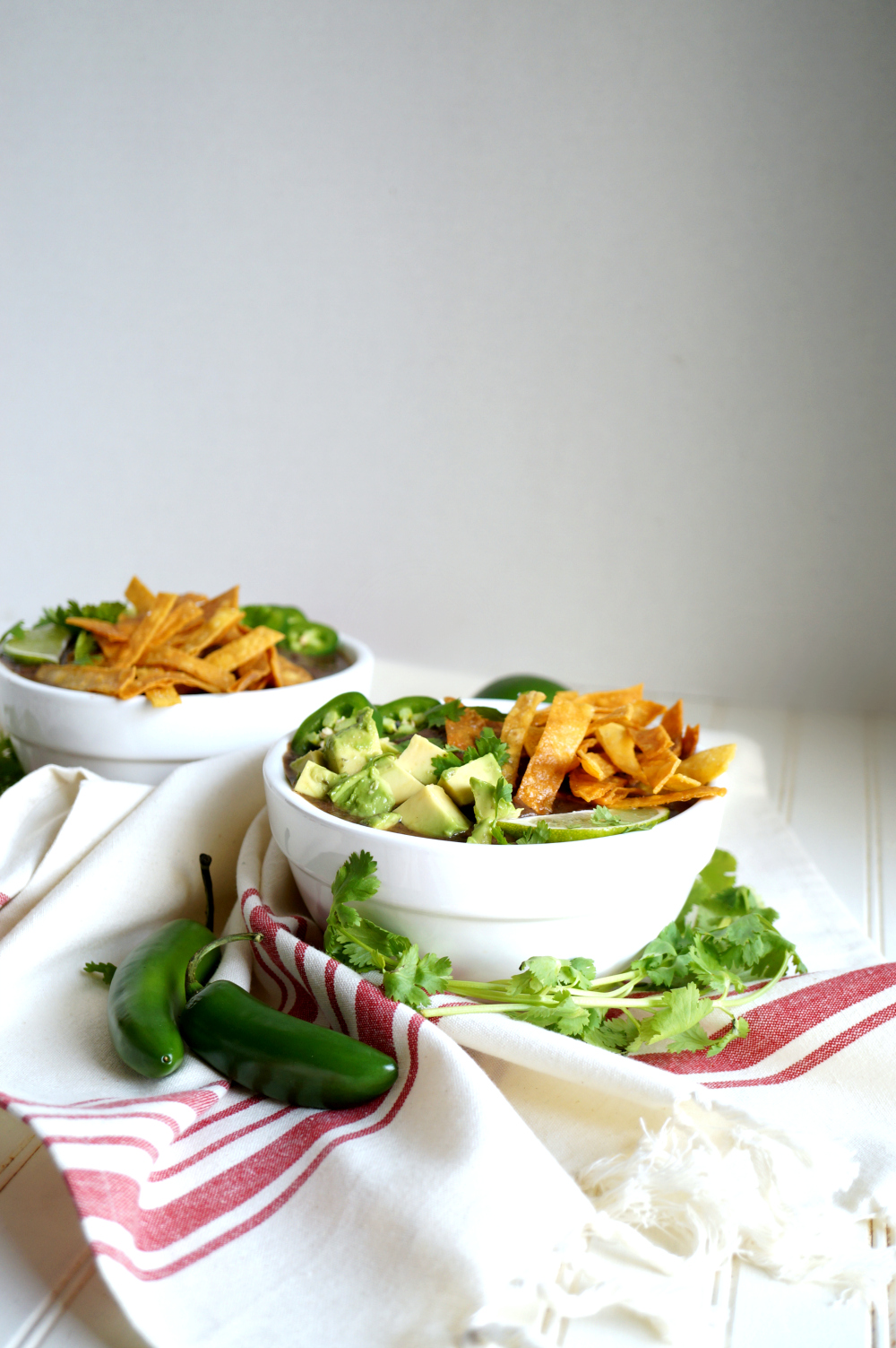 - to serve: tortilla strips avocado, jalapeno slices, fresh cilantro, lime wedges