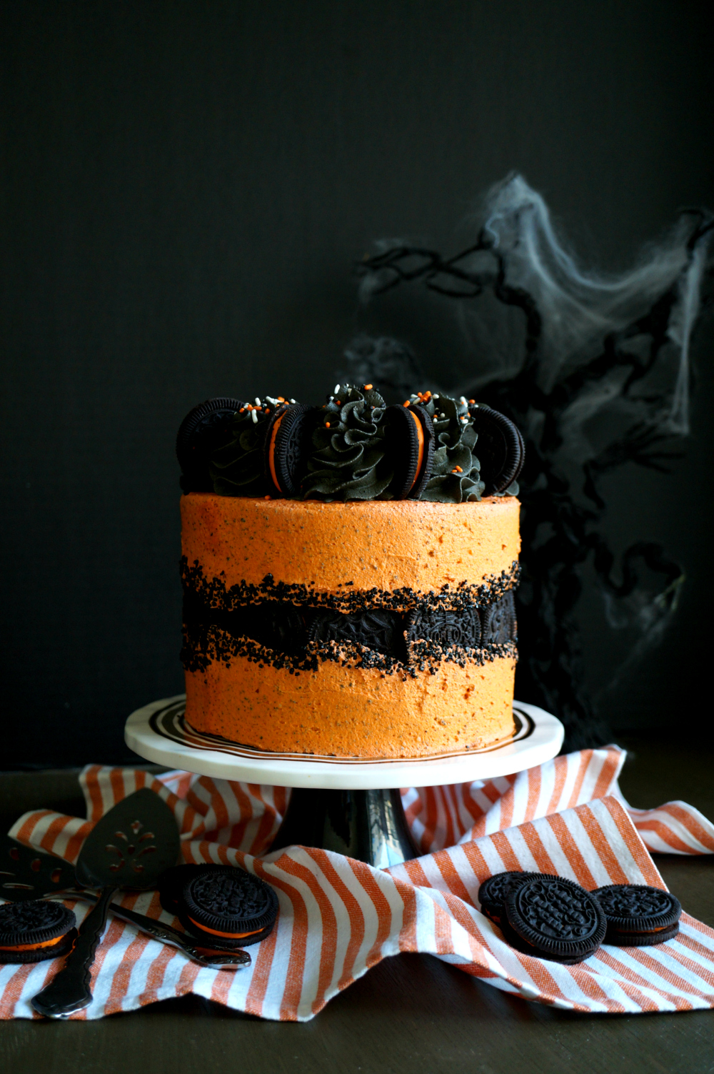 I am sure you have seen the fault line cake trend on social media, and I just KNEW it would be perfect to try for this week! I hadn't seen any cakes with an Oreo fault line, so I needed to make it happen. The Halloween edition Oreos have the classic black chocolate cookie with bright orange filling, which was perfect for this cake! Inside, you have layers of vanilla cake with chunks of crushed cookies mixed right in the batter. They're layered with black chocolate frosting, and the whole thing is covered with an orange cookies & cream frosting on the outside!
