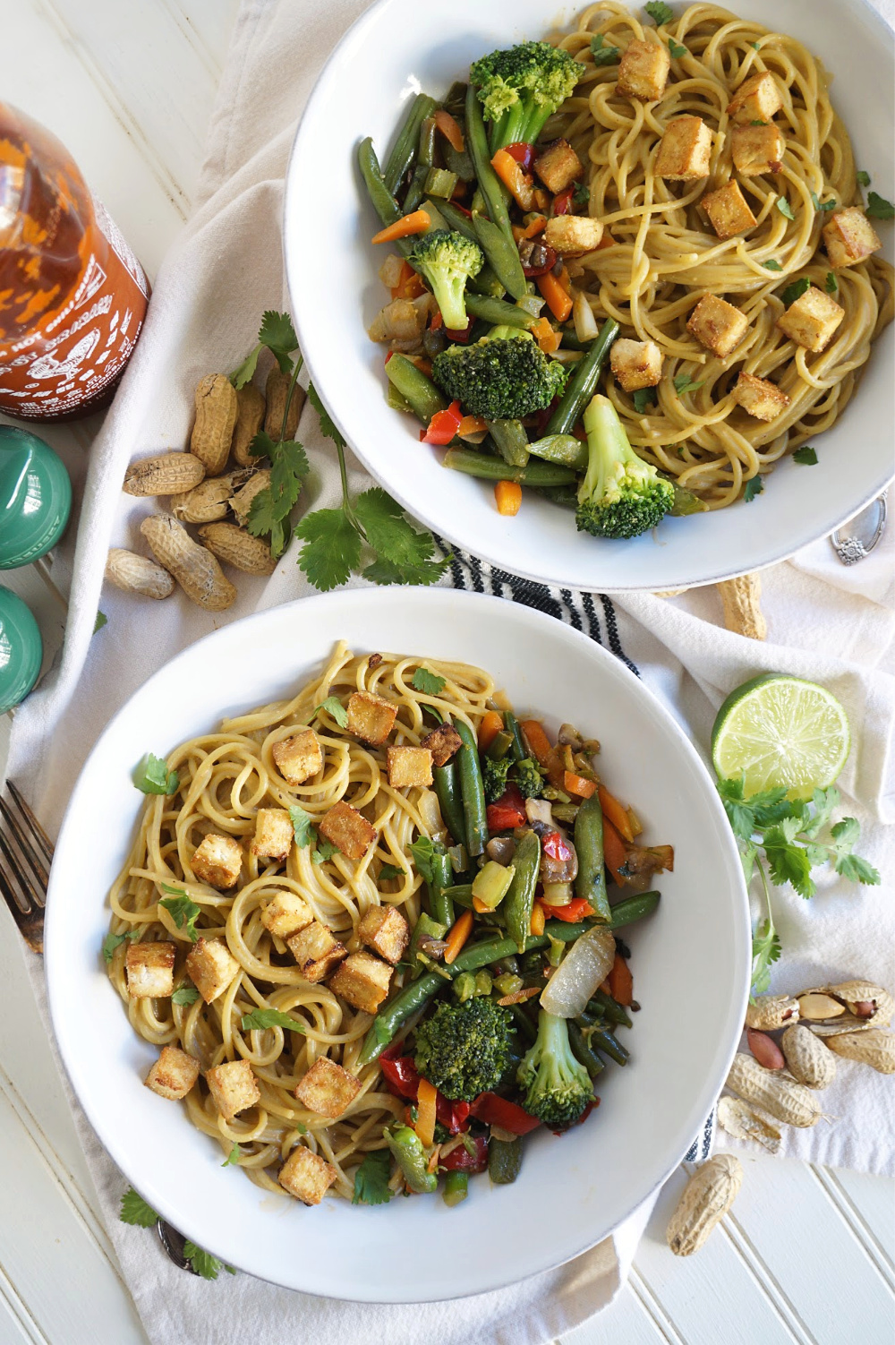 I hope you guys will give these peanut noodles a spin! They are so delicious, comforting, and come together so quickly! If you are only making the noodles, then dinner is ready in the time it takes the pasta to cook. If you want to make the tofu with it, then you'll just need about 30 minutes so it can bake! This is super flexible though, so feel free to make it with whatever you have at home 🙂