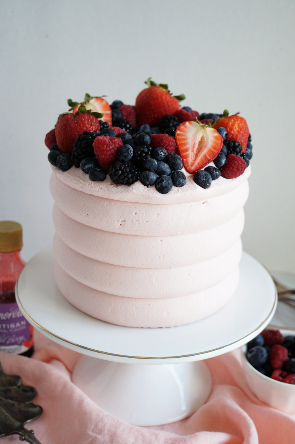 - Fresh berries: while the wild berry flavoring does a lot of the heavy lifting, fresh berries are still a must to make this cake extra delicious! I used a mixture of blueberries, raspberries, blackberries, and strawberries for the perfect combination of flavors.
