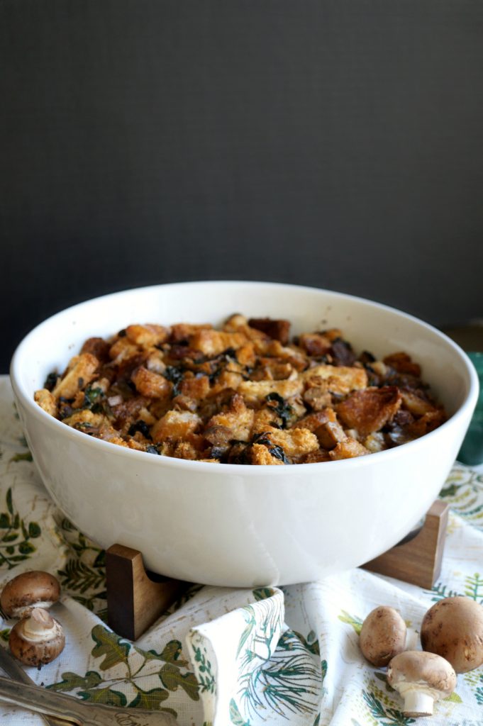 vegan sourdough stuffing with mushrooms, sausage, and swiss chard